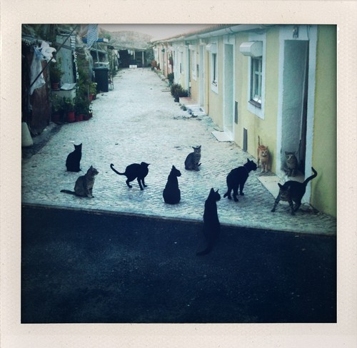 Esta é a cena habitual ao fim da tarde, quando saio da Garage. Todos os dias me cruzo com uma dezena de gatos que se estendem entre a rua e o passeio empedrado que marca as ruas de um bairro muito especial, onde as casas têm dimensões muito reduzidas. Murakami, o escritor japonês que tem quase sempre gatos nos cenários dos seus contos e histórias, devia gostar de conhecer este bairro e estes gatos.