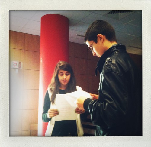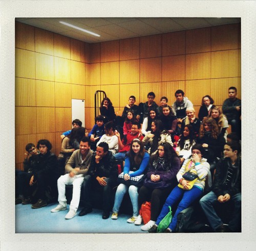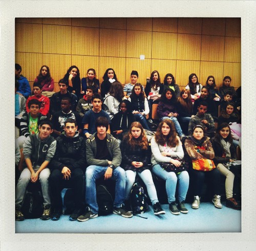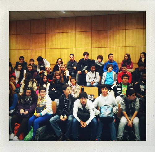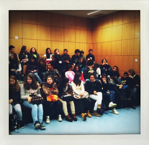 Aterrei em Lisboa e fui directa para a Escola Pedro Santarém, em Benfica. Estava combinado ir lá falar sobre jornalismo com quatro turmas do 8º ano e assim foi. Conversámos durante uma hora e meia e adorei estar ali com estas turmas. Às tantas já tinha 'tocado' para sair e eles permaneciam no auditório. Muito bom. Gosto muito, muito de ir a escolas e gostei particularmente destes alunos e das perguntas que fizeram. A Daphne e o David, na fotografia em baixo, simularam uma entrevista minha. Muito giro. Obrigada pelo convite e pela atenção durante a conversa. Mesmo quando falavam uns com os outros não foi tempo perdido, muito pelo contrário. Parabéns aos profs por estes alunos, também!