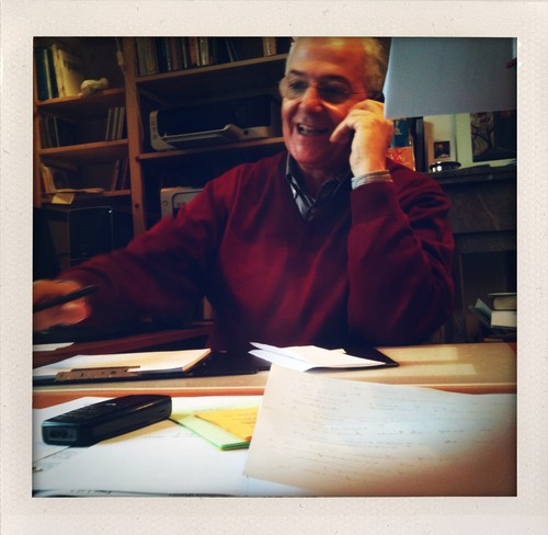 Os meus dias aqui dividem-se em duas metades quase rigorosamente iguais: numa metade estou a gravar e na outra a desgravar. Ou melhor, numa estou a gravar a imagem e o som das minhas conversas com o pe Alberto de Brito, e na outra estou a transcrever linha por linha, palavra por palavra tudo o que gravei. É um trabalho fabuloso que me permite ouvir e compreender em profundidade tudo o que me vai dizendo. Não trouxe tripé, para não andar a carregar muitas coisas comigo no Metro, ou pelas ruas (andamos quilómetros a pé quando viajamos por outras cidades!), e por isso improvisámos um tripé com dicionários. Funciona bem e a imagem está sempre estável. O pe Alberto só fala sobre temas interessantes e isso prende a atenção do primeiro ao último minuto das gravações. Fazemos poucas pausas porque ele atende poucas chamadas, mas hoje aproveitei um dos seus telefonemas da tarde para fotografar o meu canto no seu escritório. Eis o sofá onde me sento e a pilha de livros onde pouso a máquina fotográfica com que também filmo. Adorava falar da matéria dos livros mas o segredo é a alma do negócio, em todos os negócios. Livros e publicações incluídos... Assim sendo, aqui fica este post que espero que funcione como teaser para um livro que, se tudo correr bem, há-de estar pronto e à venda no início de 2011. Para já aquilo que posso dizer é que não posso estar mais contente nesta fase e nesta cidade.