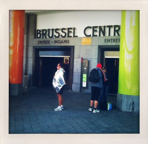 É a segunda vez seguida que me acontece passar uma semana em Bruxelas com céu azul, limpo, e 'sol de Lisboa'. Na semana em que gravámos as entrevistas para a série Portugueses Sem Fronteiras nunca choveu e agora, que voltei a esta cidade quase sempre cinzenta e com chuva, faz sol e está uma temperatura muito agradável de Outono. Fico por aqui até dia 17. Vim gravar entrevistas, mas desta vez para publicar em livro. Mal possa, conto melhor o que estou aqui a fazer. Agora tenho que ir. Deixo aqui 2 fotos de ontem, à chegada à estação central, pouco tempo depois de ter acabado a famosa maratona de Bruxelas. As pessoas na rua estavam quase todas vestidas de atletas, já com os seus 'cobertores' térmicos prateados pelos ombros, para não arrefecerem depois do esforço.