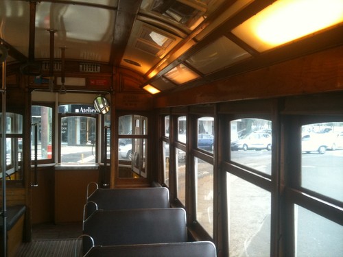 Gosto de todos os detalhes, de toda a geometria e arquitectura dos eléctricos. Não há um único pormenor feio ou que destoe, e é neste ambiente de ferros e madeiras com a patine do tempo, entre as ripas do chão e os envernizados dos tectos, que me deixo embalar e ir pela cidade fora.